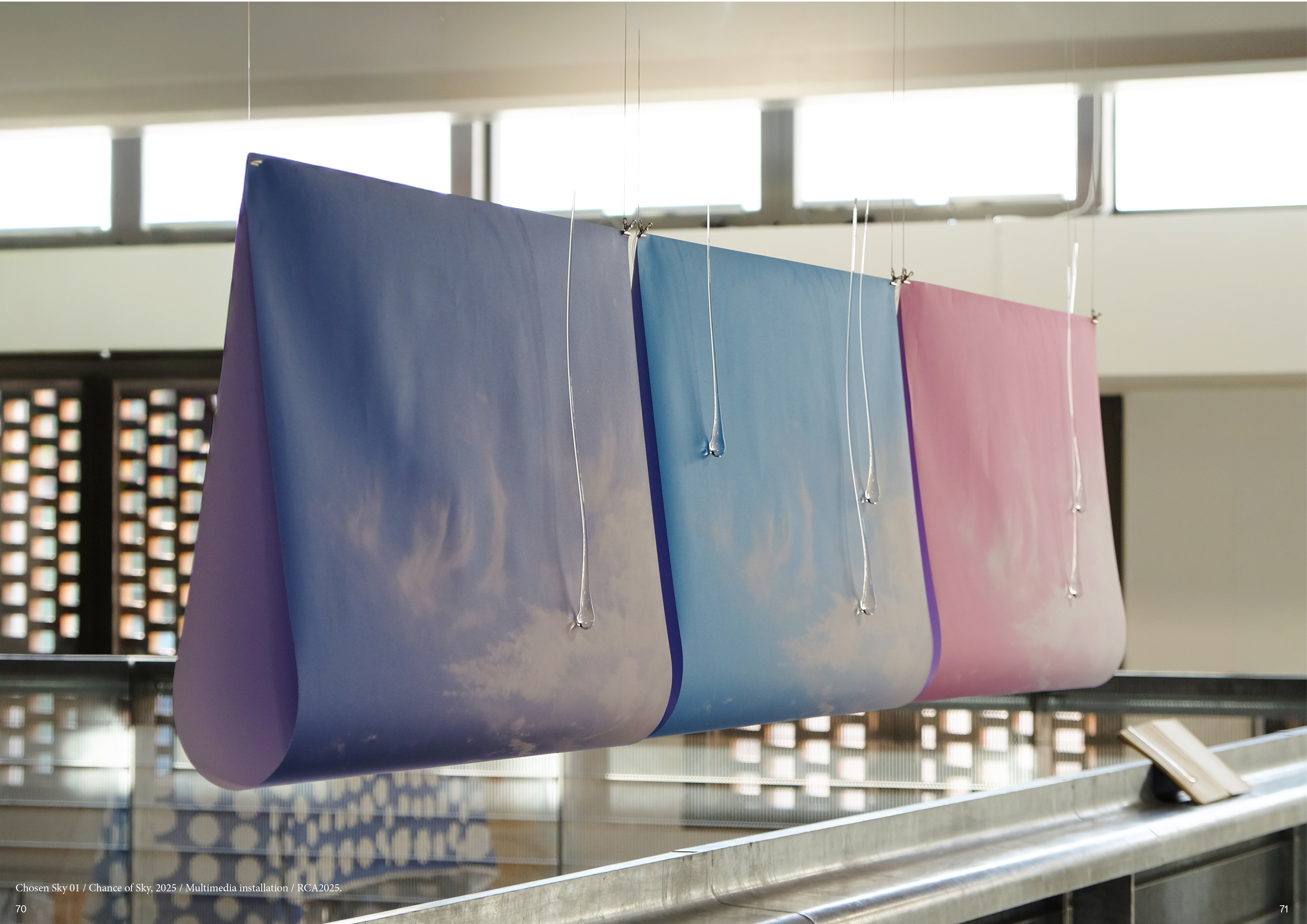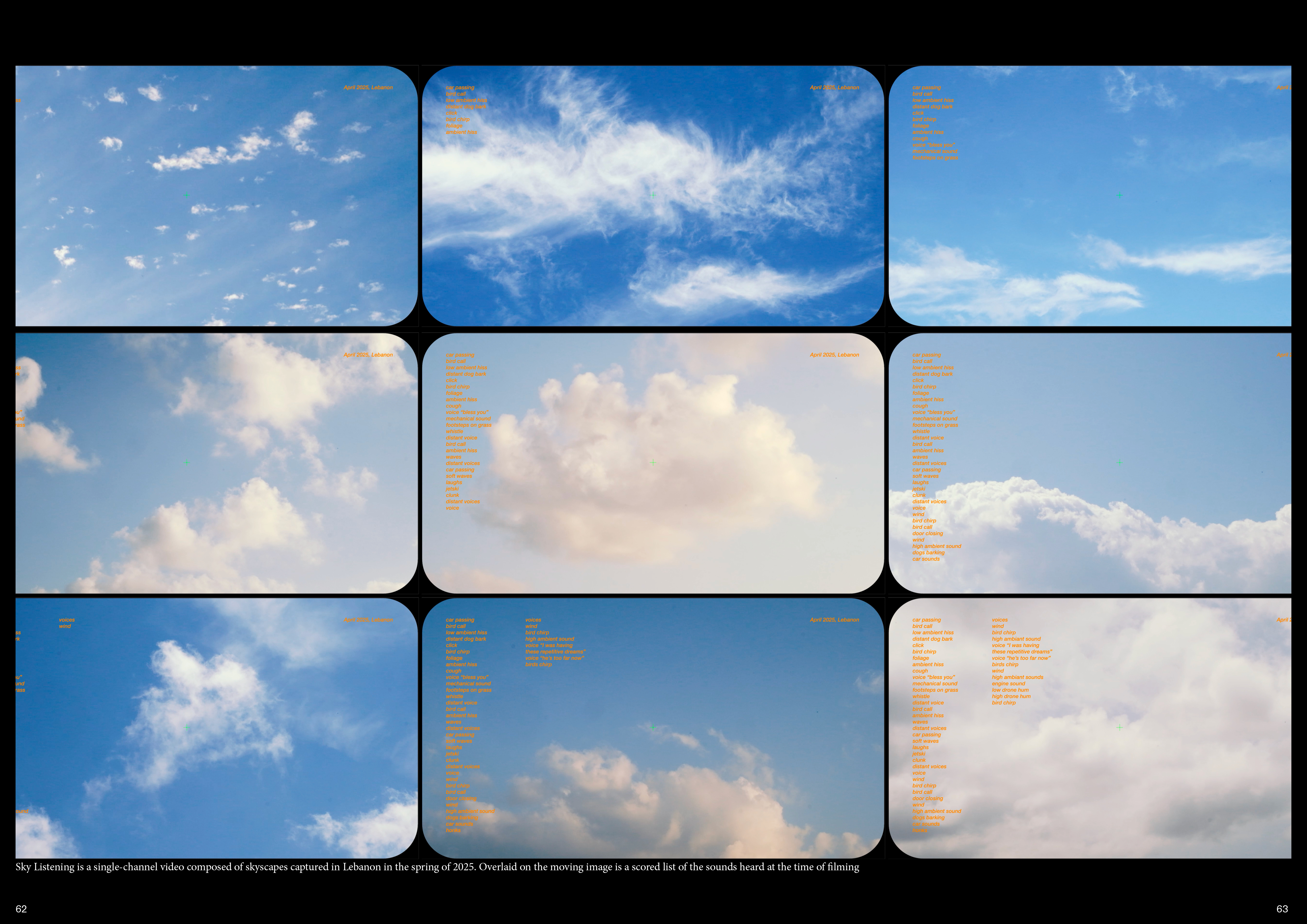 Chance of Sky uses colours, images, and sounds to reveal the twofold nature of the Lebanese sky: a wide expanse of blue that brims with promise, yet one that is never guaranteed under the weight of surveillance and the looming threat of bombardment.